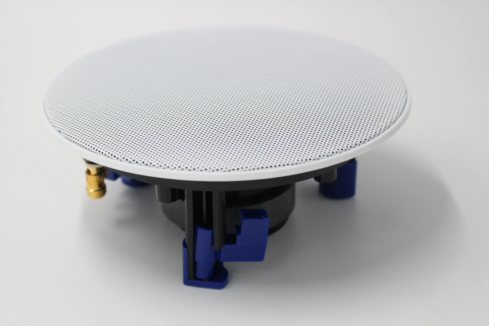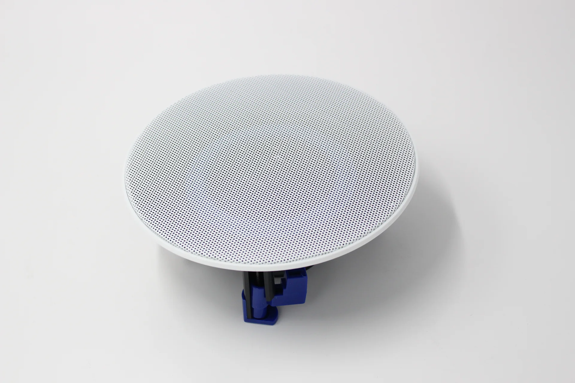 The HCS-418 in-ceiling speaker is good for bathroom use or in a living room, dining room, bedroom. It uses a blue polypropylene woofer and fluid-cooled soft- dome swivel tweeter in a coaxial design. The tweeter swivels so it can be aimed for most effective high frequency output.